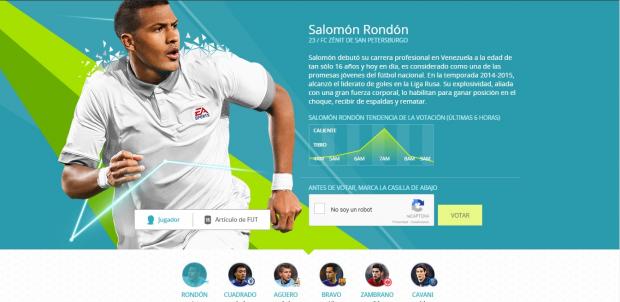 Sobre Rondón la página de EA Sports señala: “Salomón debutó su carrera profesional en Venezuela a la edad de tan sólo 16 años y hoy en día, es considerado como una de las promesas jóvenes del fútbol nacional. En la temporada 2014-2015, alcanzó el liderato de goles en la Liga Rusa. Su explosividad, aliada con una gran fuerza corporal, lo habilitan para ganar posición en el choque, recibir de espaldas y rematar”.