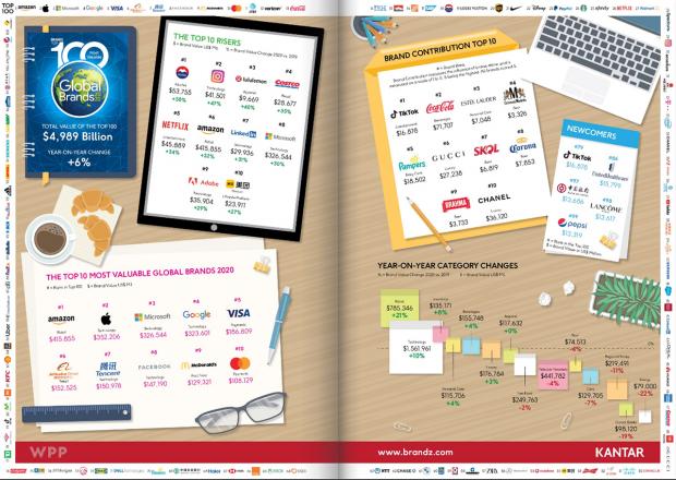 El valor total de marca del BrandZ 2020 alcanzó los US$ 5 billones (5×1012), un incremento del 5,9%, a pesar de los impactos económicos y sociales del Covid-19. Las marcas de tecnología mantienen su dominio en la parte superior del ranking, creciendo en general 10%. Más de la mitad de las marcas de medios y entretenimiento aparecieron entre las 20 primeras. TikTok (n. ° 79, $ 16,9 mil millones) fue la nueva entrada más alta.