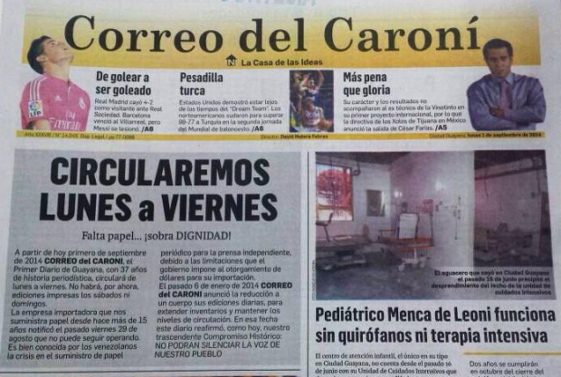 En un comunicado publicado en su primera página de este lunes, el diario guayanés, con 37 años de trayectoria, anunció que no contará con ediciones impresas los sábados ni los domingos por falta de papel. La medida se debe a que la empresa importadora que les suministraba el insumo desde hace más de 15 años no podrá seguir operando.