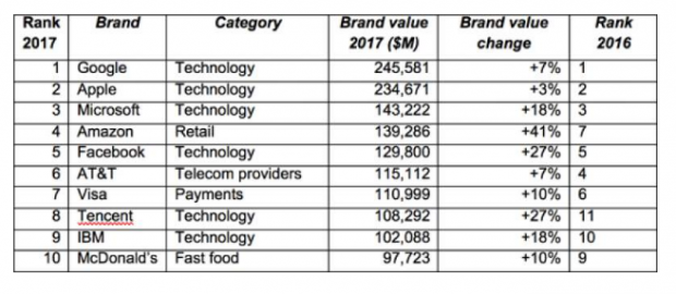 Así pues, el top 5 presentado cada año por la consultora Kantar Millward Brown y WPP del ranking BrandZ Top 100 Most Valuable Global Brands 2017, está ocupado por empresas de tecnología. El valor de estas todas poderosas que encabezan la lista, equivale al 25% del total del valor del resto del top 100.