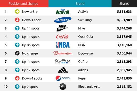 En el informe se dio a conocer las 10 marcas más virales del 2014, en el cual se destaca que las tres firmas ganadoras realizaron videos en el marco de la Copa del Mundial. Samsung ocupó el segundo lugar con 4,3 millones shares, mientras que los videos Nike fueron compartidos 3,8 millones de veces. Otras marcas que figuran en el top 10 son Coca-Cola, en el cuarto lugar; NBA, en el quinto; Budweiser, en el sexto; GoPro, en el séptimo; Pepsi, en el noveno; y Electronic Arts en el décimo.